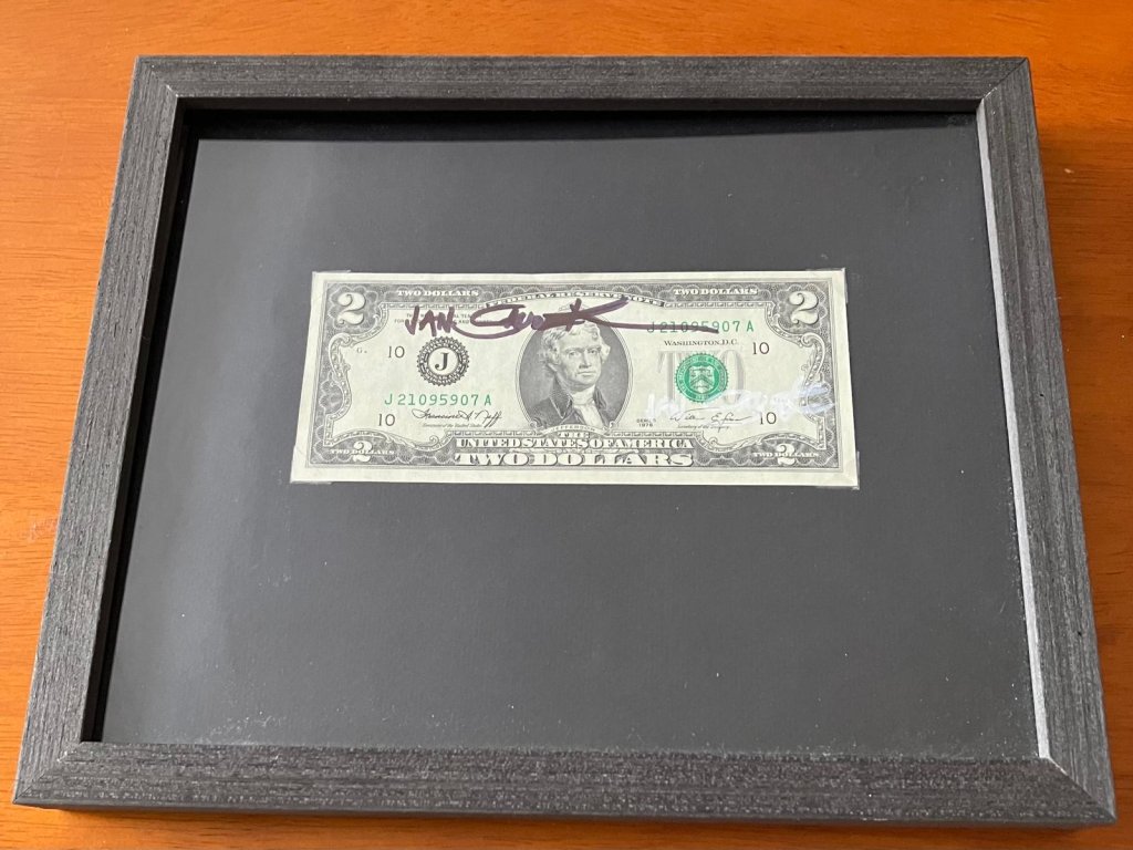 Unikátní dvoudollarovka 7,8 x 15,5 cm, 2x signováno fixou, rámováno, v perfektním stavu. Celková velikost s rámem 22 x 27 cm.