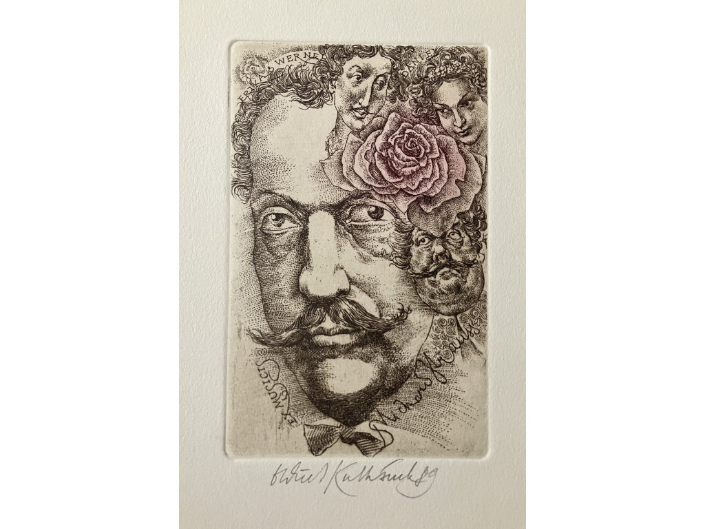 Barevný lept věnovaný slavnému rakouskému skladateli. Lept 13,7x8,7 cm. Velikost listu je 24x16 cm. Signováno a datováno.