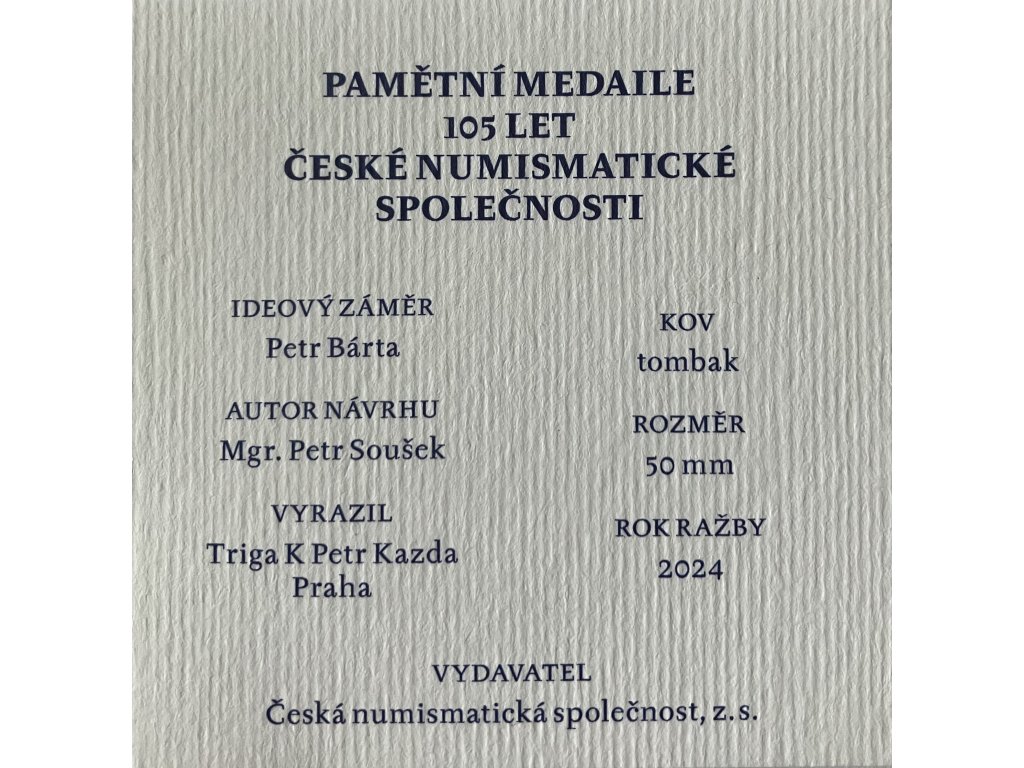 Medaile vydaná ke 105. letům vzniku ČNS. Velikost 50 mm, materiál tombak, ražba 2024. Na aversu vidíme pohled na Strahovský klášter v Praze. Na reversu je knihovní sál strahovského kláštera.